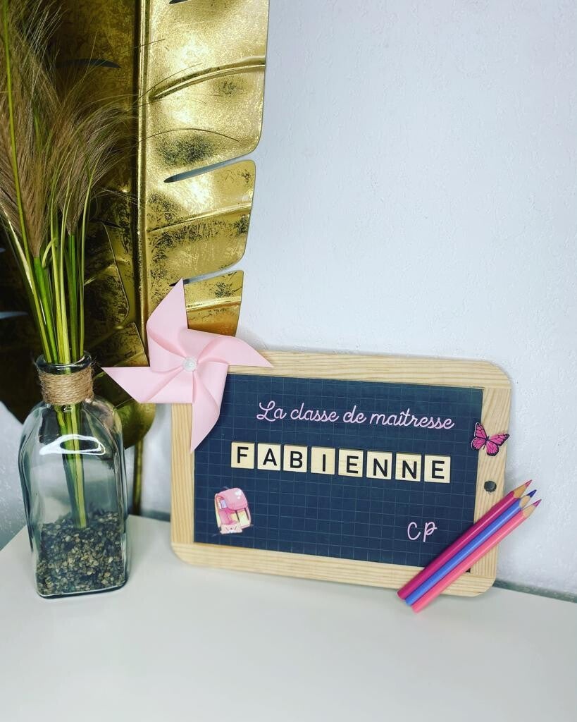 Chaque pièce est réalisée avec soin et peut être entièrement personnalisée : prénom, classe, décorations (moulin à vent, crayons, stickers, papillons, etc.).