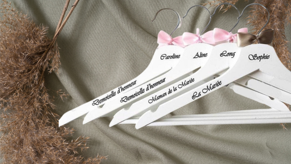 Le cintre blanc est personnalisé (prénom,rôle, date du mariage par exemple) avec un nœud en satin (couleur au choix)